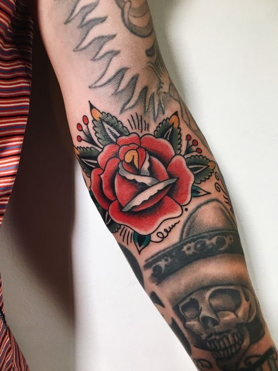 - Roses: Souvent associées à l'amour, la passion et la beauté. Les roses rouges éclatantes sont un classique intemporel des tatouages Old School.