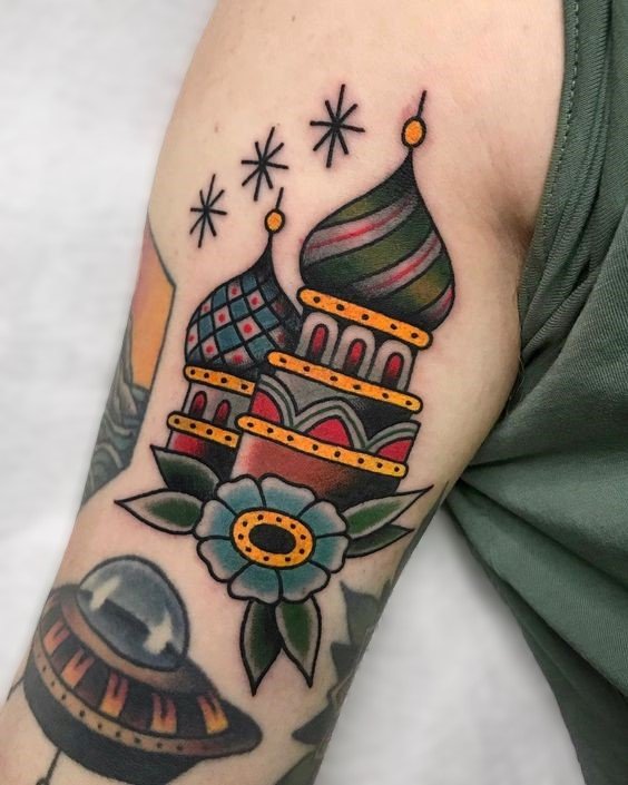 L'élément clé de ce style est le contour noir épais, qui donne aux dessins une clarté et une luminosité uniques. La palette de couleurs est limitée à des teintes traditionnelles : rouge, jaune, vert, bleu et noir, ce qui confère à ces tatouages une esthétique vintage qui traverse les âges.