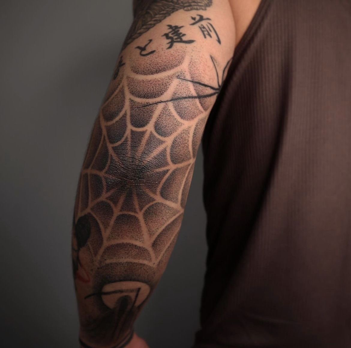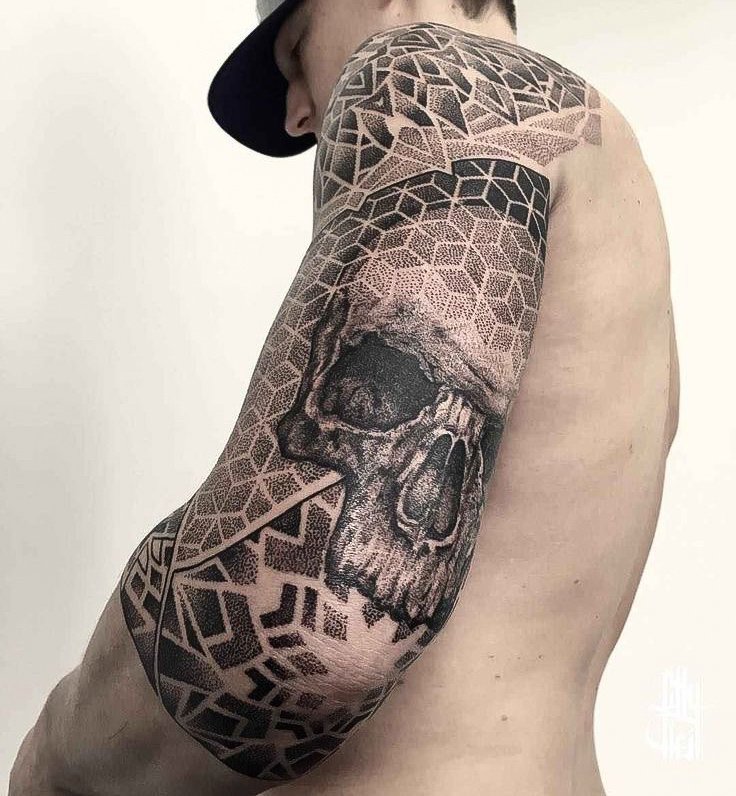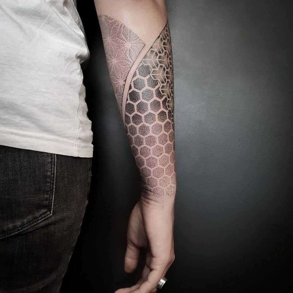 La réalisation de tatouages en technique «dotwork» nécessite une patience remarquable et une vision spatiale de la part du tatoueur.