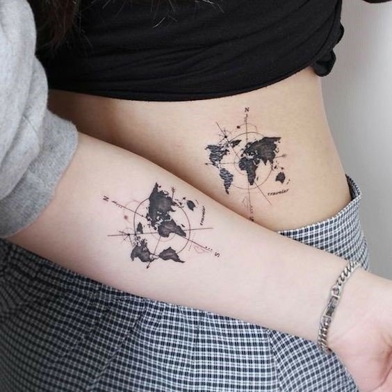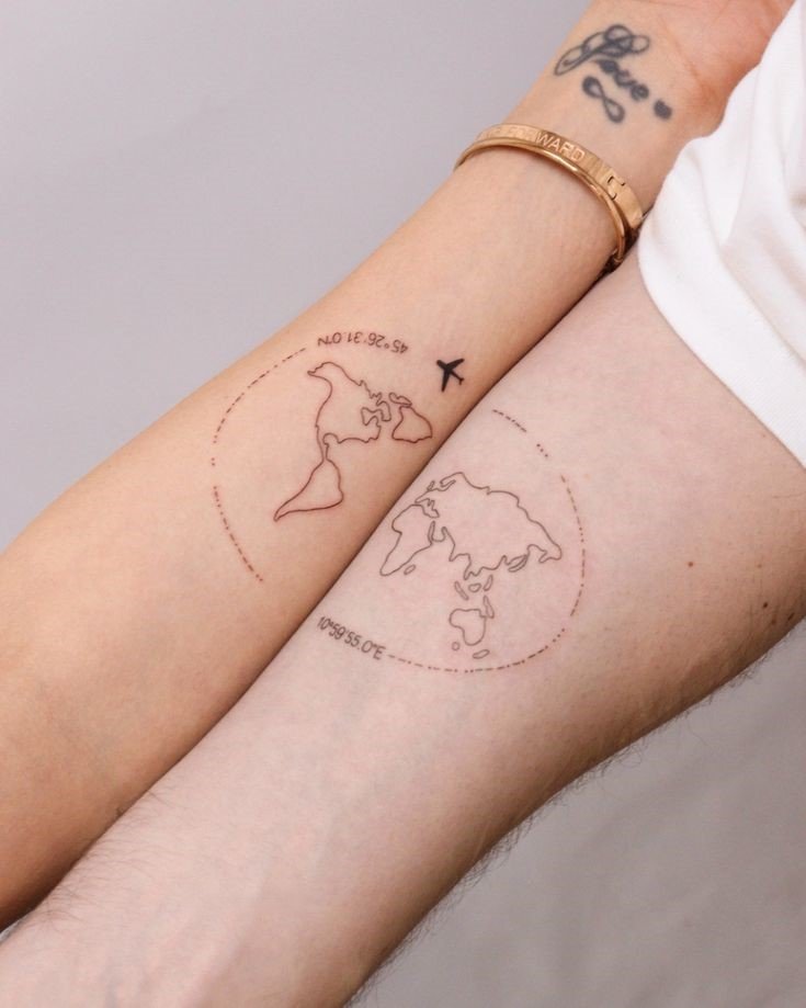 Si vous avez un endroit spécial lié à des souvenirs importants, vous pouvez l’immortaliser sous forme de tatouage. Par exemple, l’un des partenaires peut choisir une carte de cet endroit, tandis que l’autre opte pour un symbole associé à cette ville ou ce pays. Cela peut être une ligne d’horizon, des contours de continents ou des coordonnées, soulignant ainsi l’importance de ce lieu pour vous deux. Ces tatouages ne sont pas seulement esthétiques, ils portent aussi un sens personnel profond. - Motifs floraux comme symbole de croissance