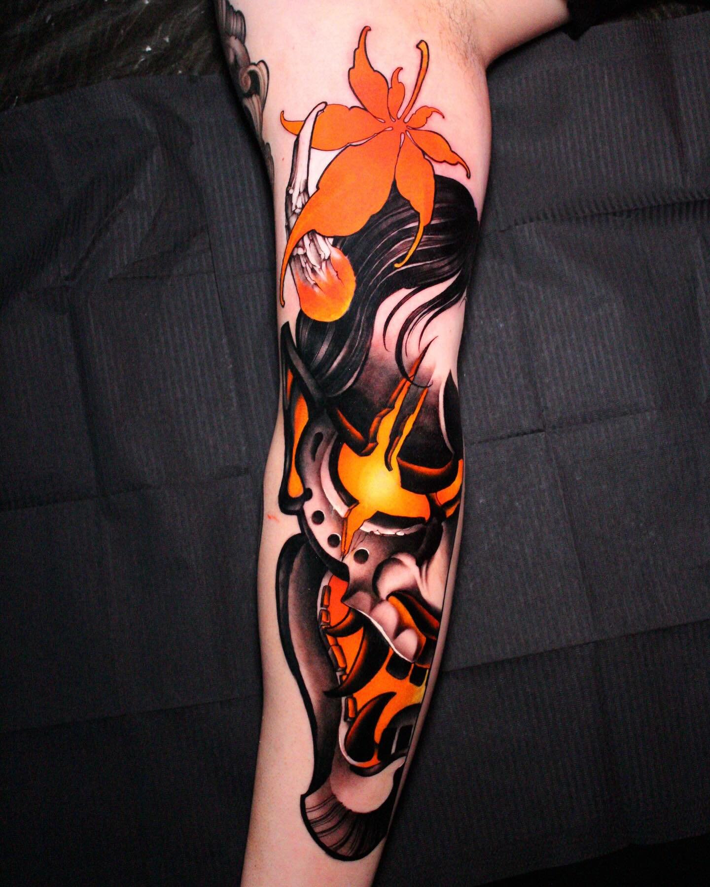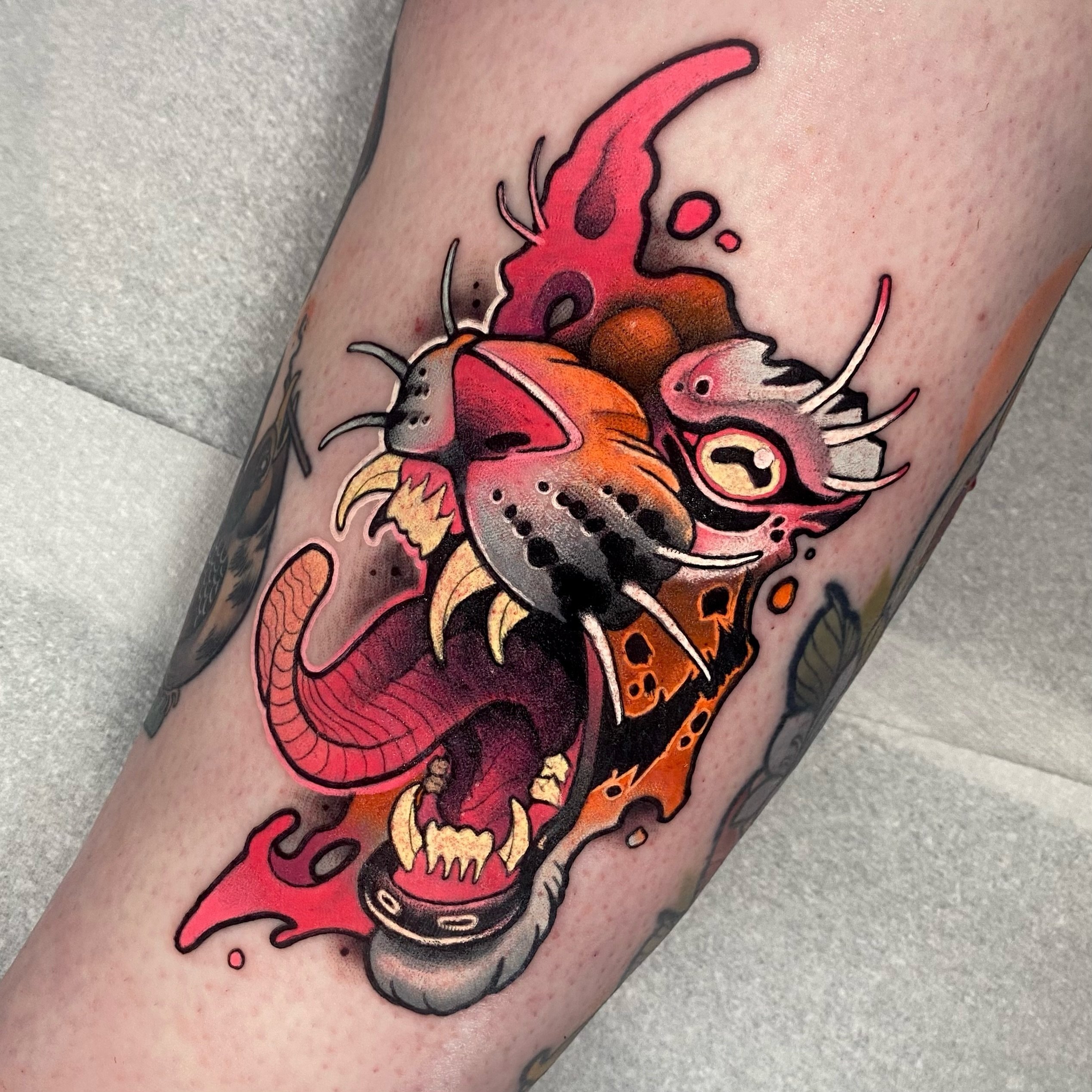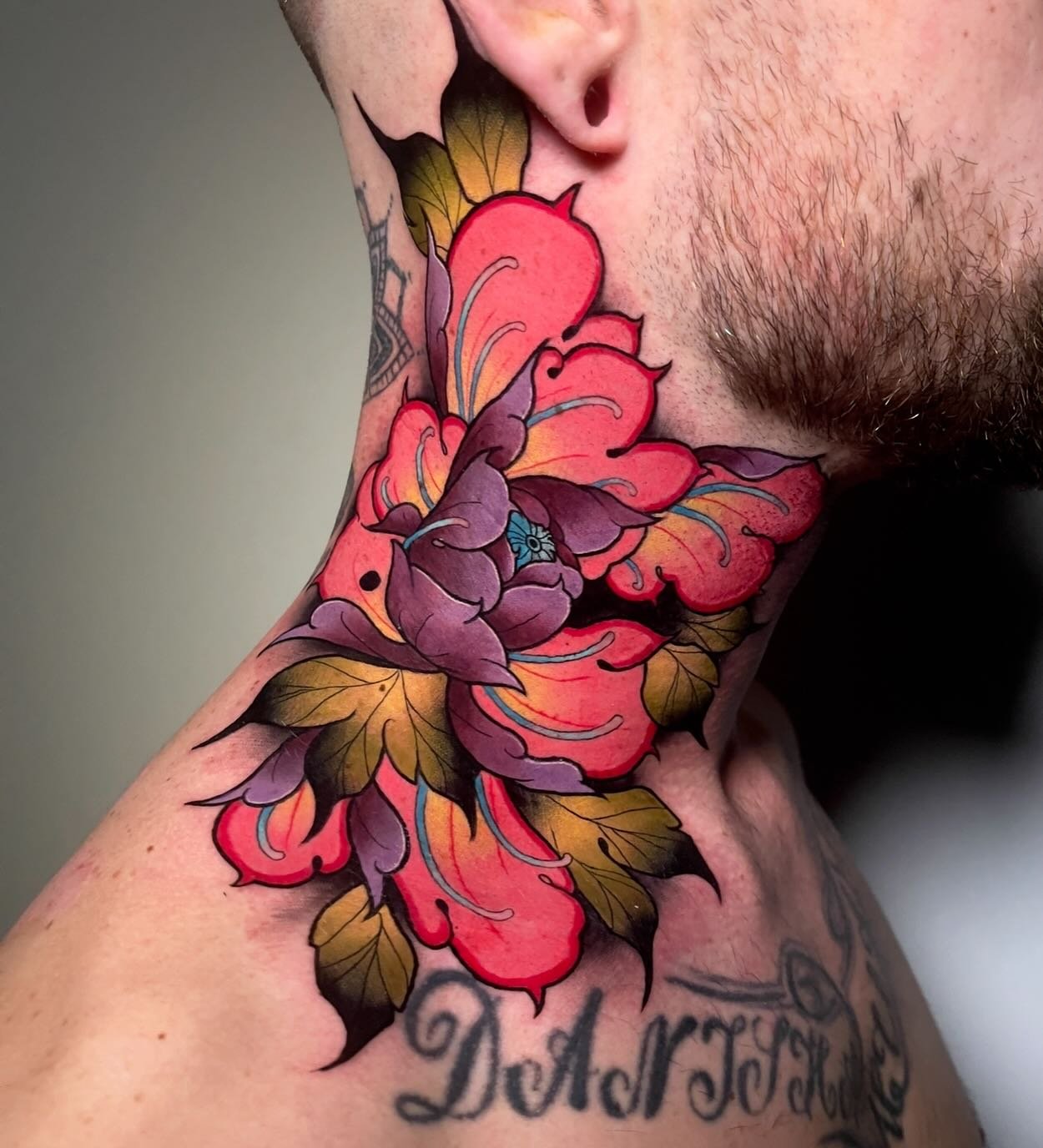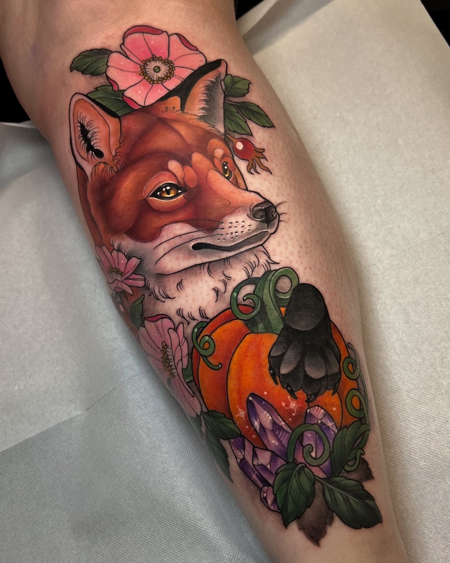 Les tatouages Neo Traditional se caractérisent par des contours clairs et des lignes expressives, ce qui rend les images lumineuses et durables. L'utilisation de couleurs vives et saturées est un aspect clé de ce style. Les artistes utilisent une palette étendue, incluant des teintes rouges profondes, bleues, vertes et oranges, qui donnent vie et volume aux tatouages. Pour créer de la profondeur et de la texture, les artistes utilisent des ombrages détaillés et des dégradés, ajoutant réalisme et dramatisme à l'image. Ces tatouages combinent souvent des éléments de réalisme avec des formes abstraites, permettant aux artistes d'expérimenter différentes techniques et de créer des designs uniques.