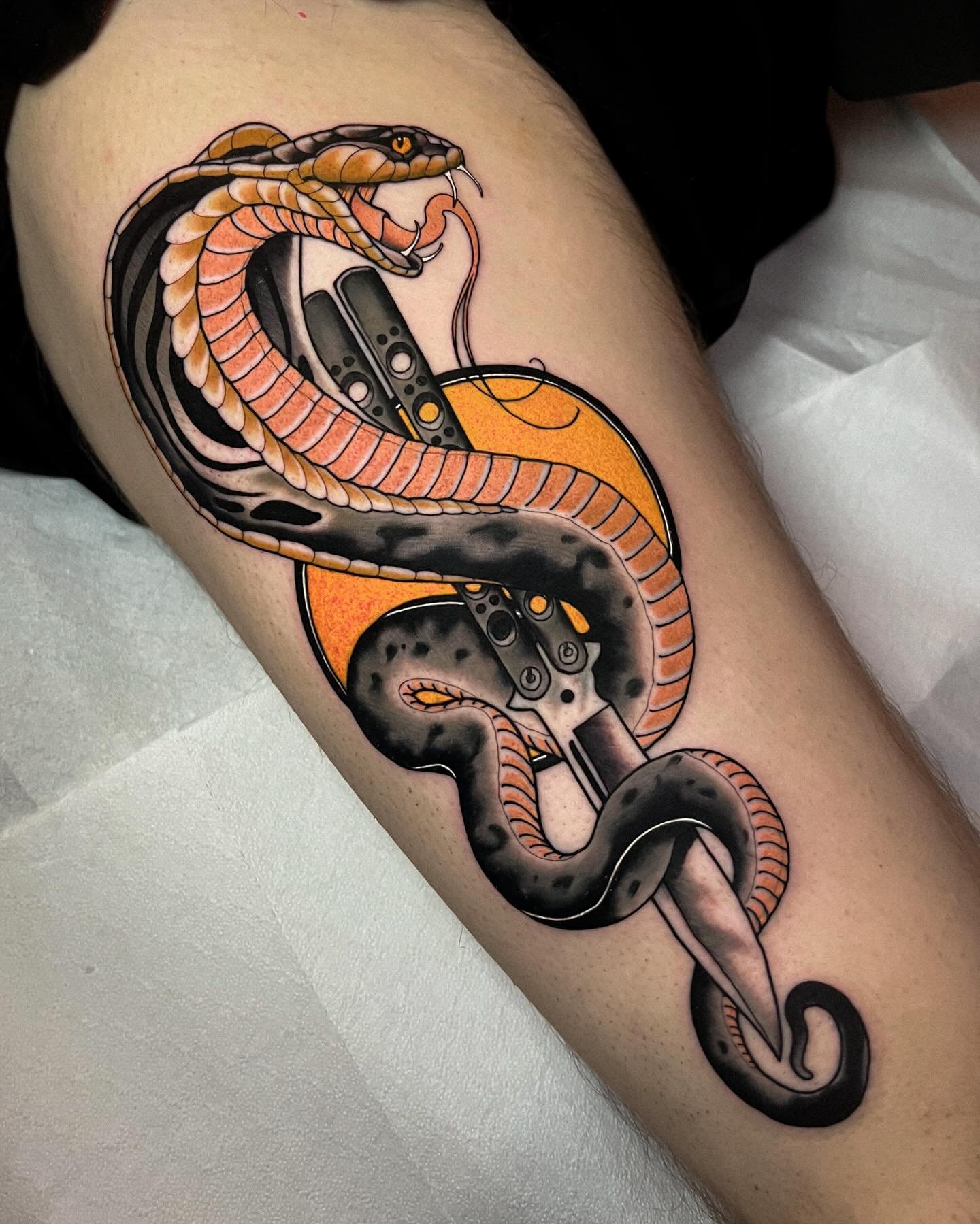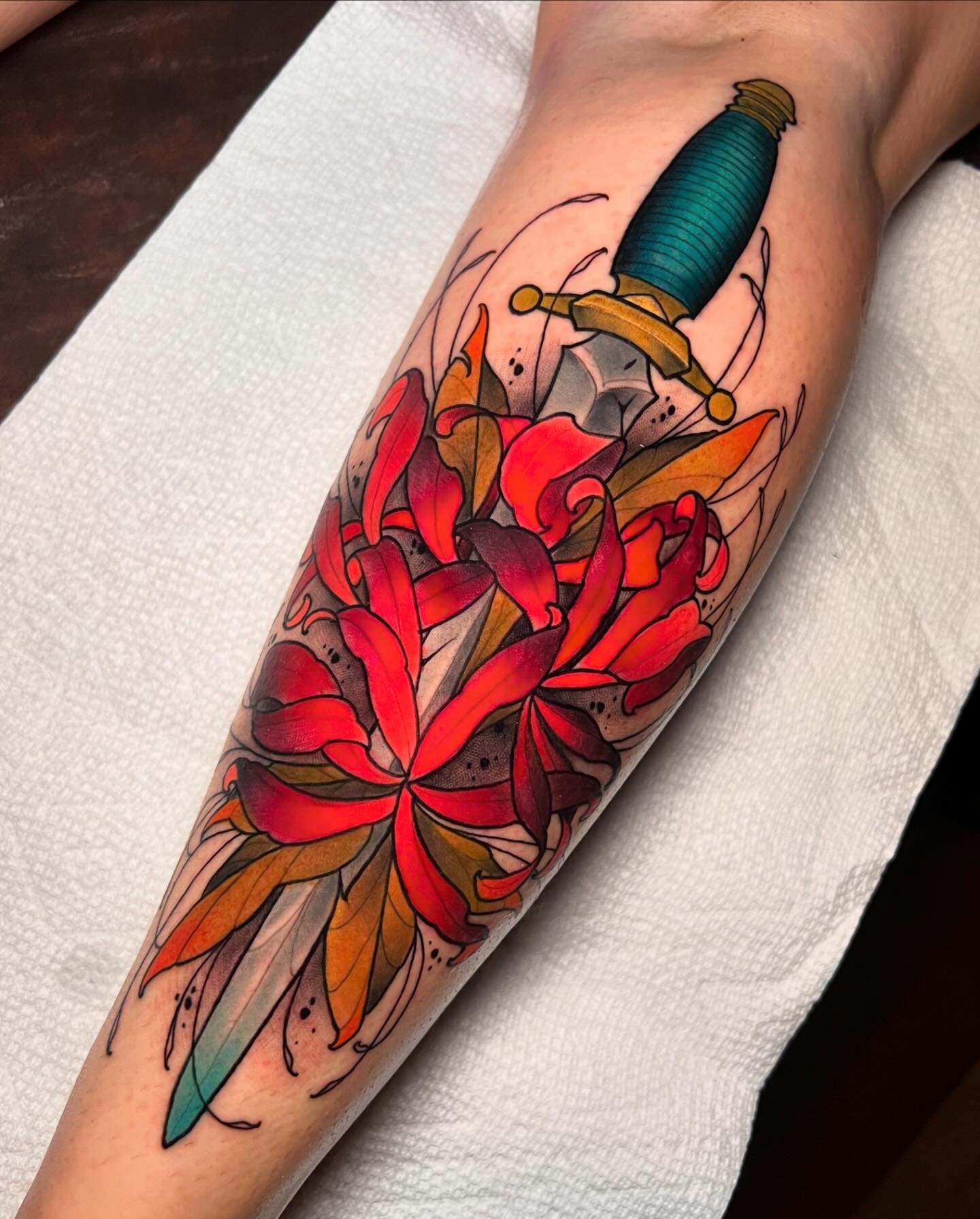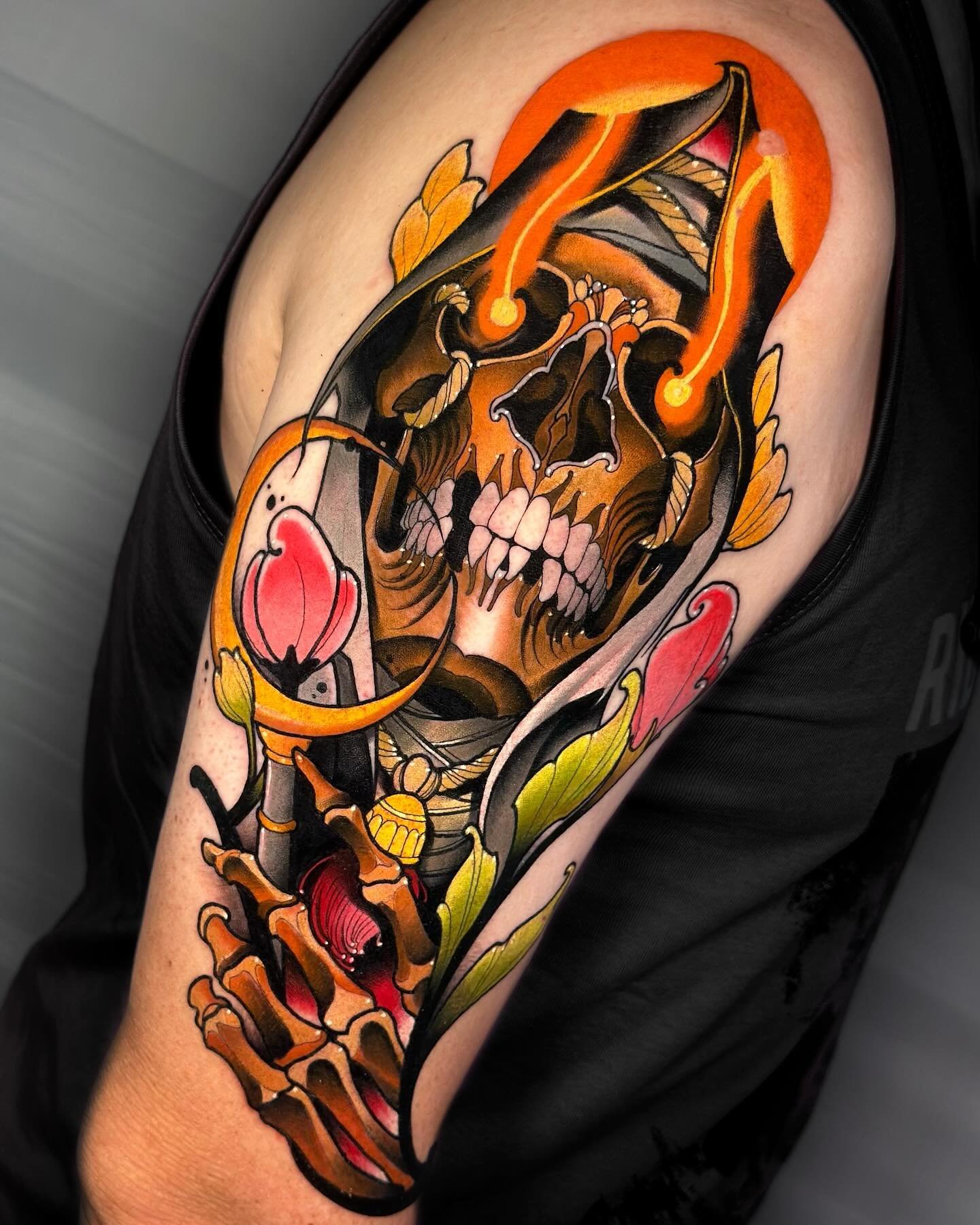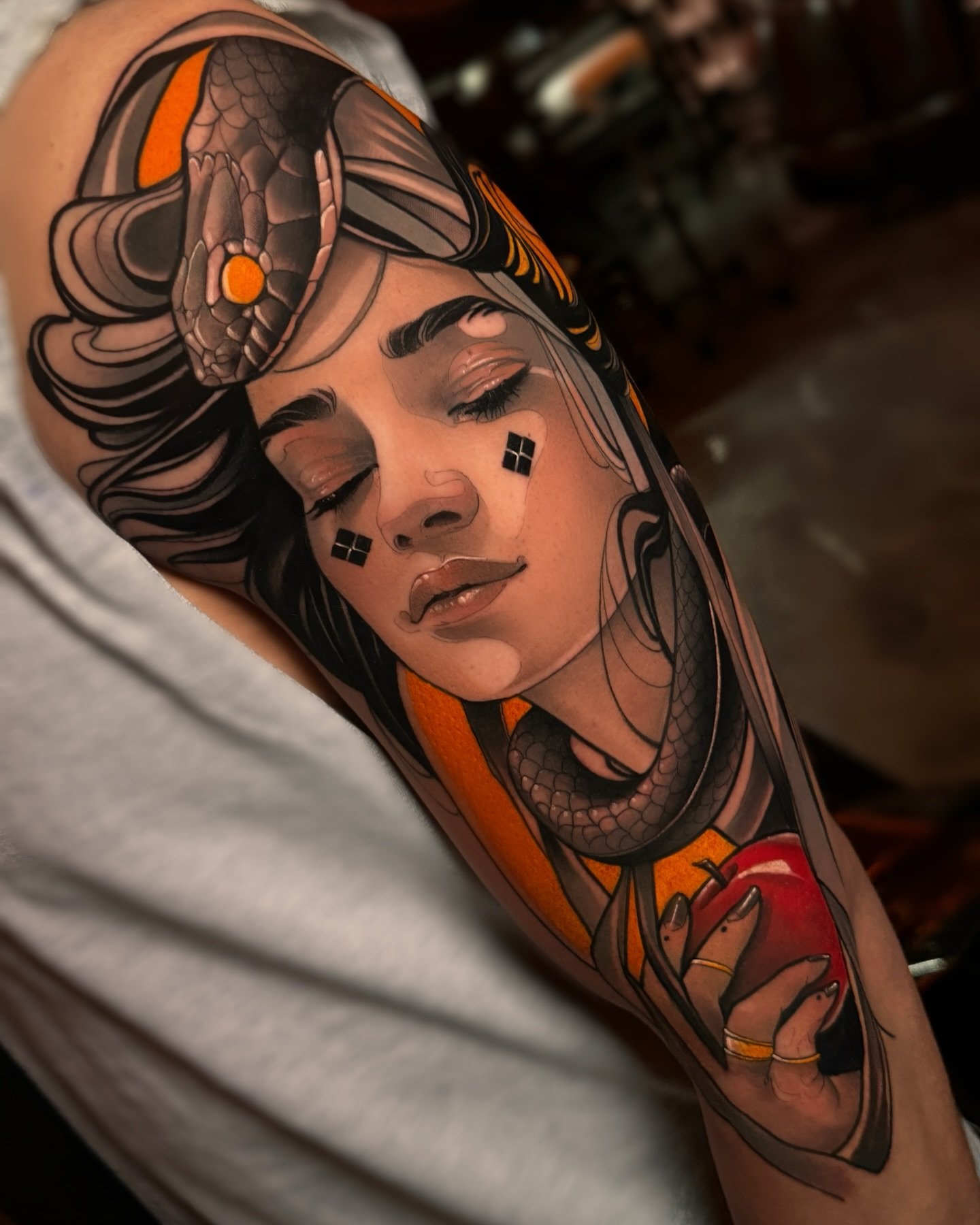 Les tatouages Neo Traditional se caractérisent par des contours clairs et des lignes expressives, ce qui rend les images lumineuses et durables. L'utilisation de couleurs vives et saturées est un aspect clé de ce style. Les artistes utilisent une palette étendue, incluant des teintes rouges profondes, bleues, vertes et oranges, qui donnent vie et volume aux tatouages. Pour créer de la profondeur et de la texture, les artistes utilisent des ombrages détaillés et des dégradés, ajoutant réalisme et dramatisme à l'image. Ces tatouages combinent souvent des éléments de réalisme avec des formes abstraites, permettant aux artistes d'expérimenter différentes techniques et de créer des designs uniques.