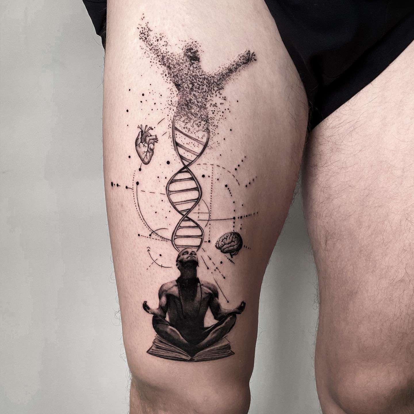 - Évolution et Progrès : L'ADN représente non seulement une information statique, mais aussi un processus d'évolution et de changement. Le tatouage peut symboliser la croissance personnelle, le désir de développement et de changement dans la vie.