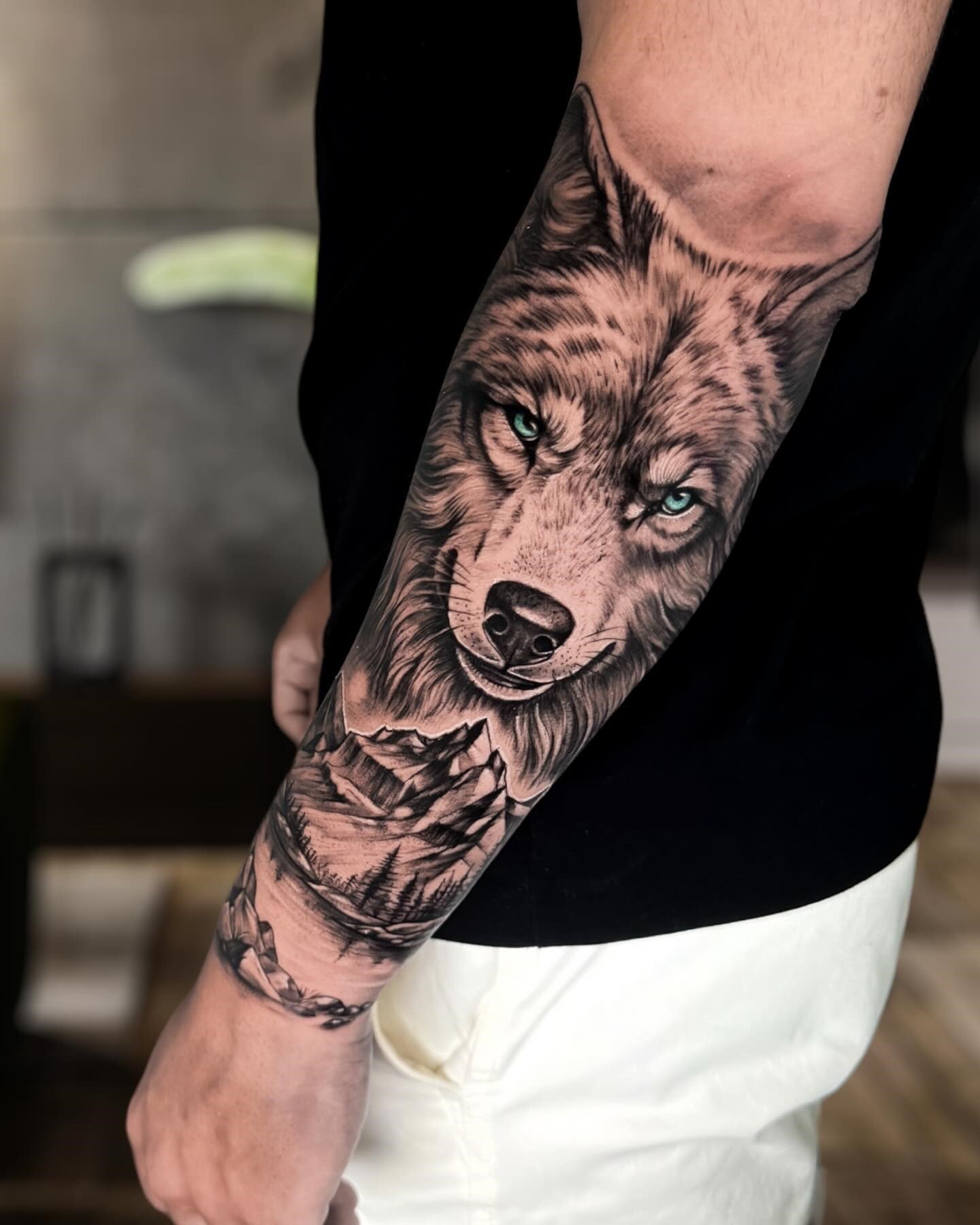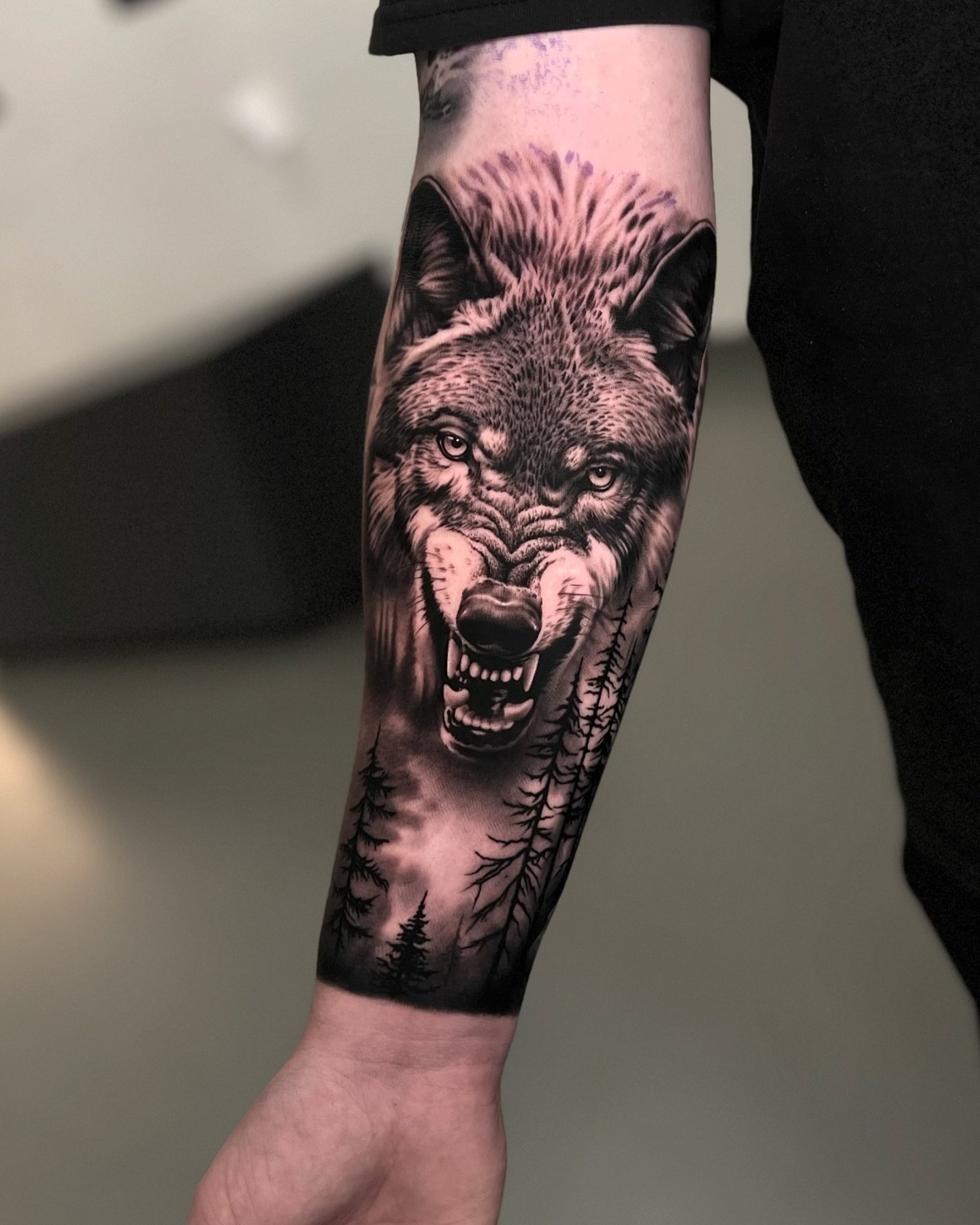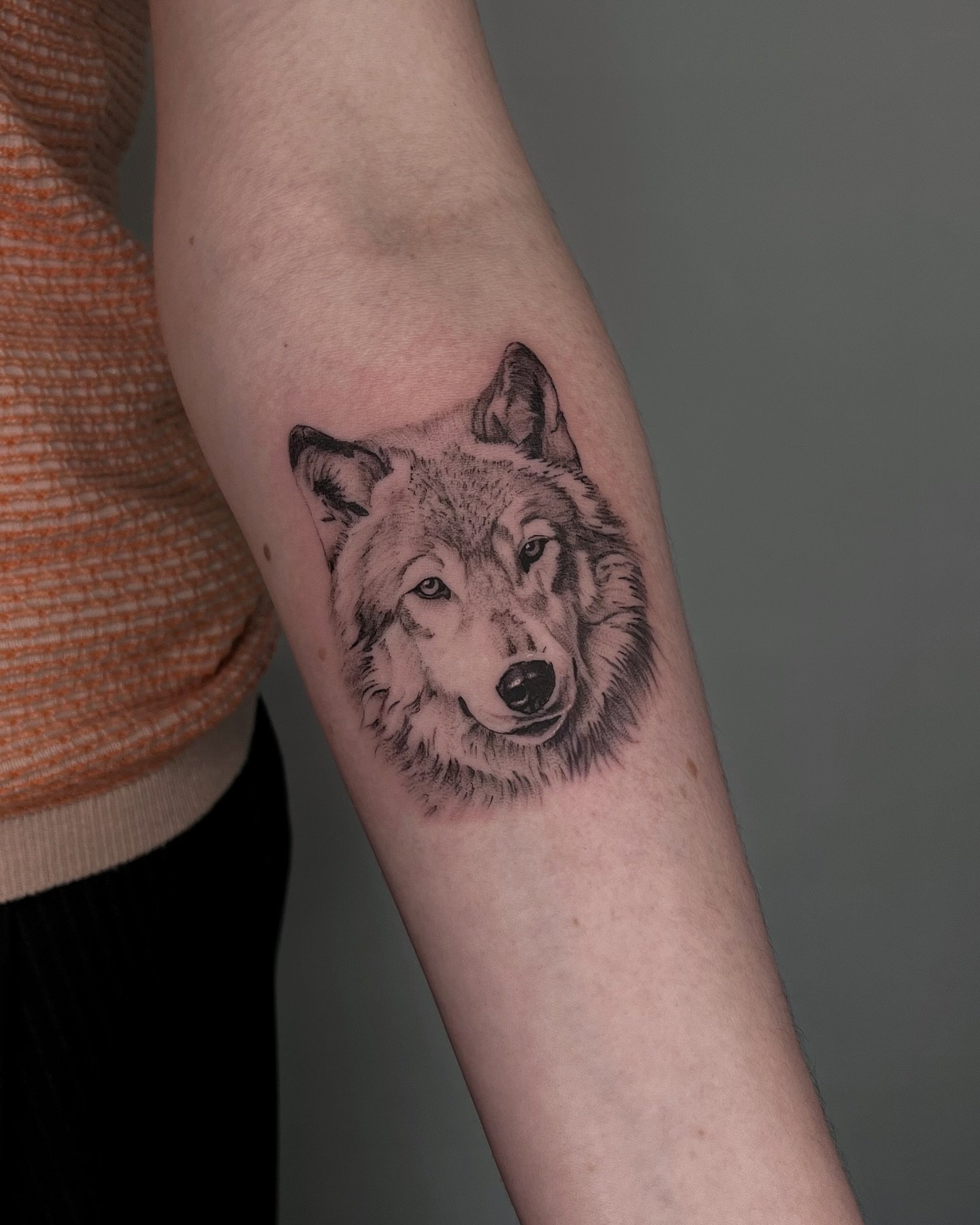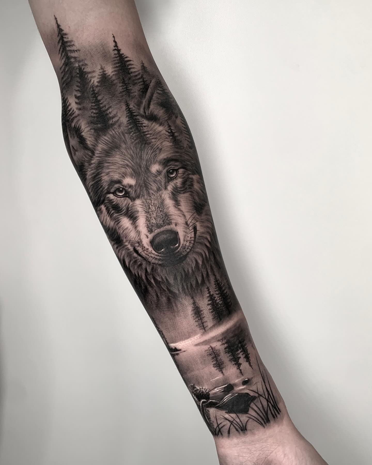 - Avant-bras. Le tatouage de loup sur l’avant-bras est souvent choisi car cette zone permet un dessin détaillé. Ici, le loup met en valeur la force de son porteur.