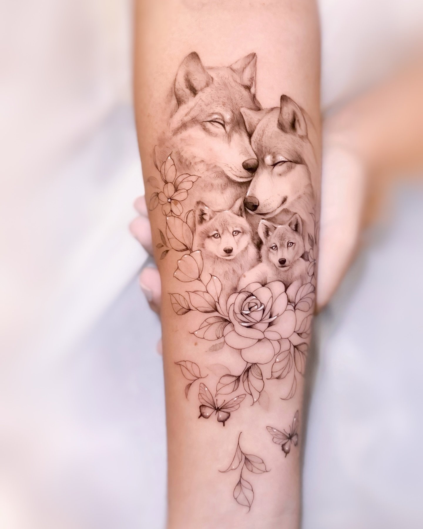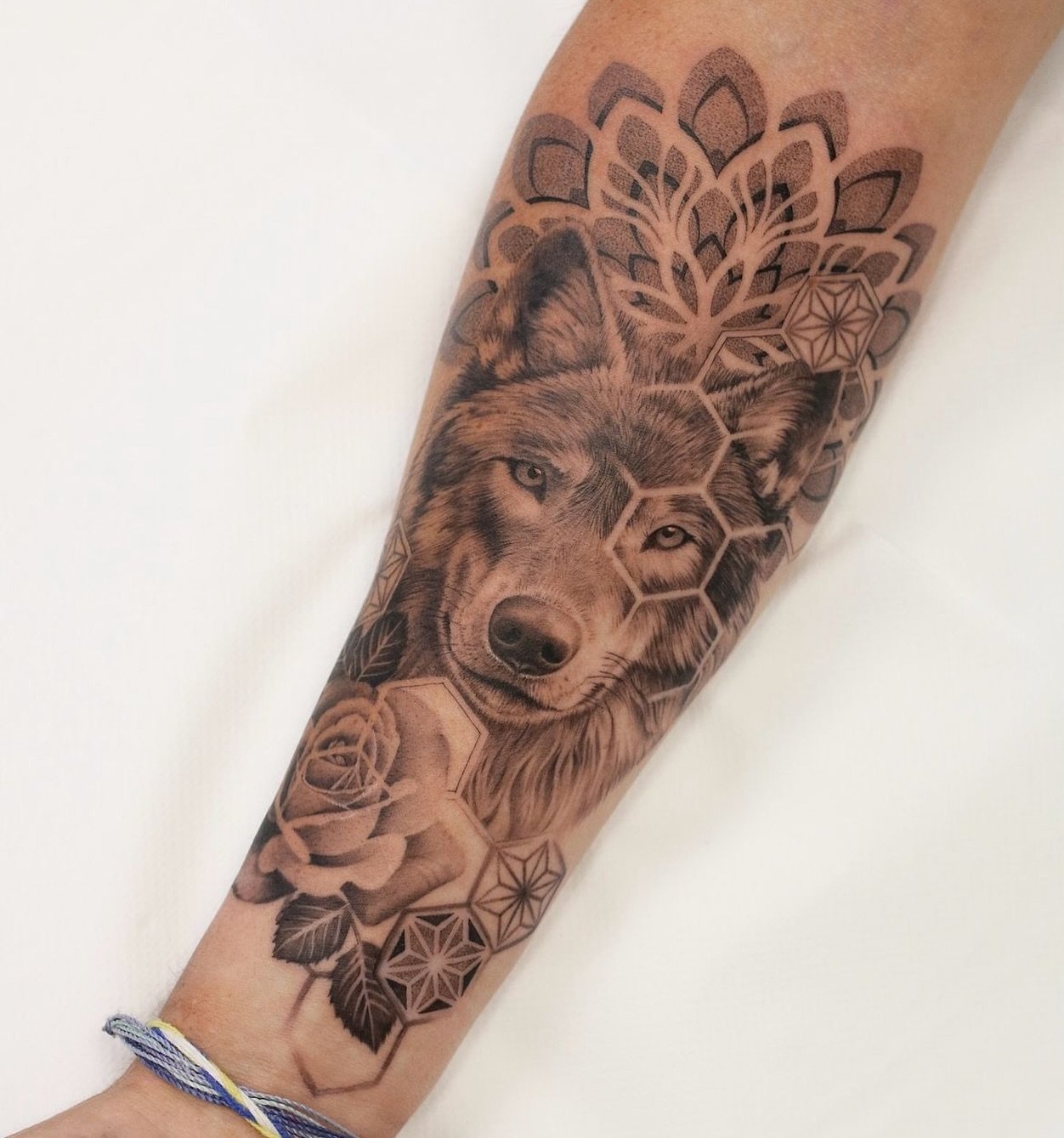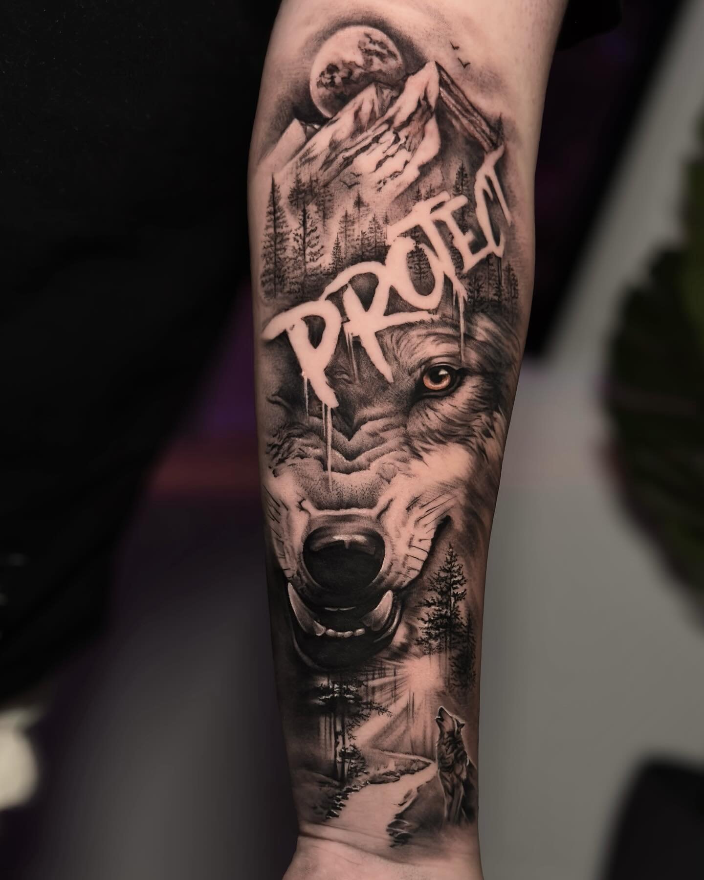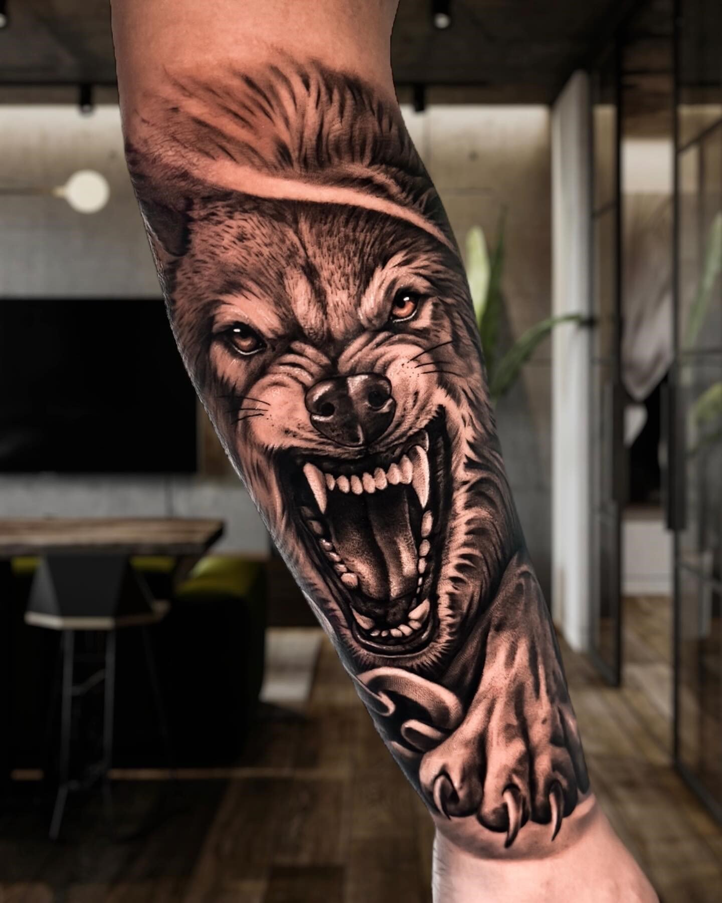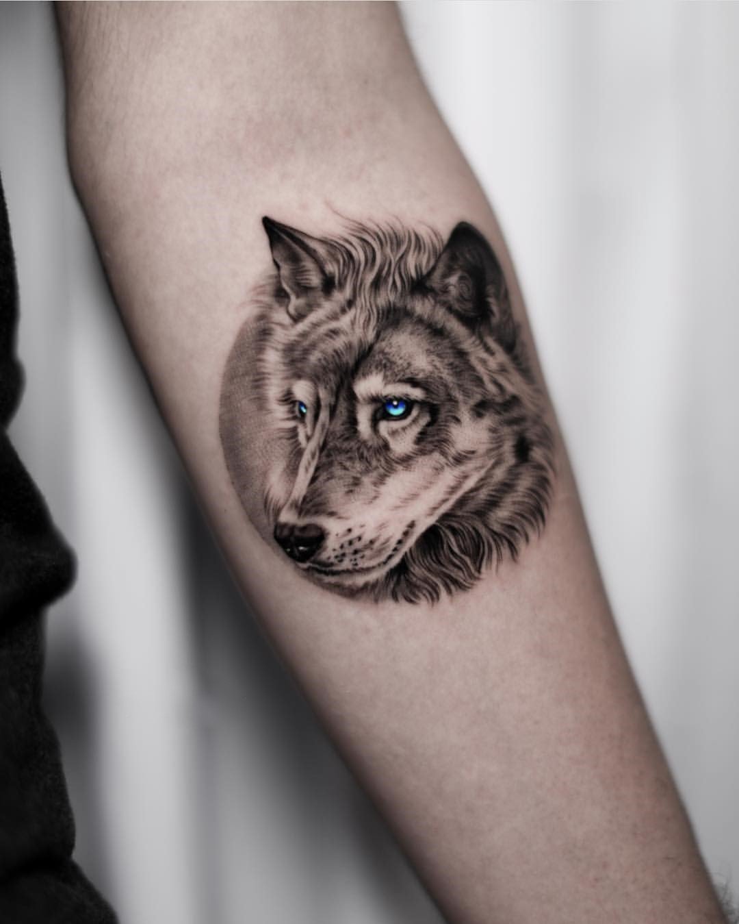 - Avant-bras. Le tatouage de loup sur l’avant-bras est souvent choisi car cette zone permet un dessin détaillé. Ici, le loup met en valeur la force de son porteur.