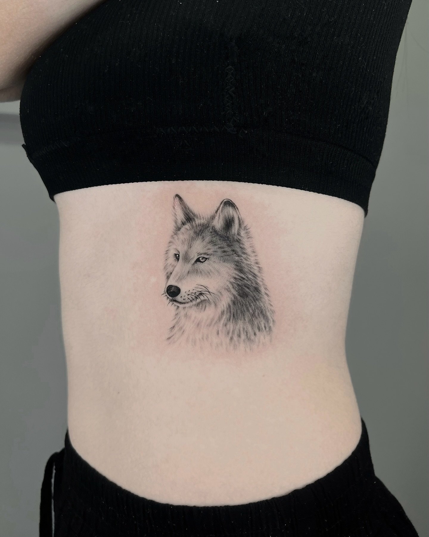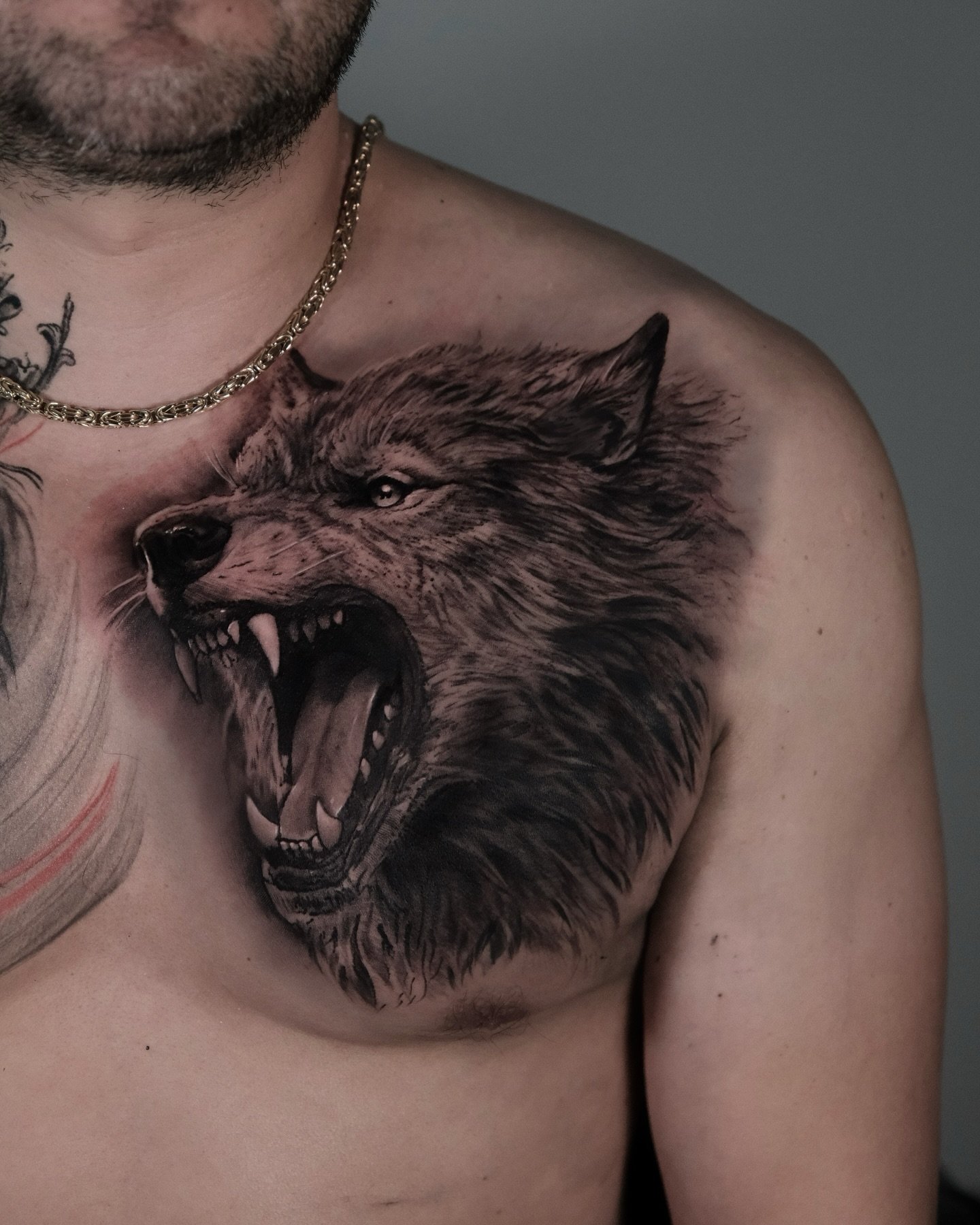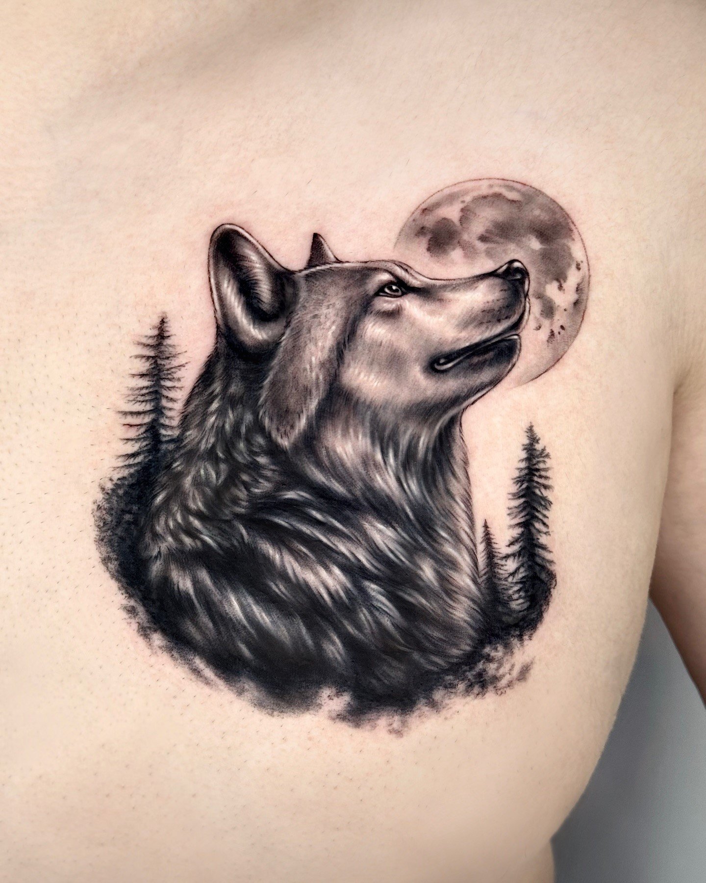 - Poitrine. La poitrine est parfaite pour un tatouage de loup de grande taille, symbolisant la force intérieure et la puissance. Ce design est souvent réaliste et riche en détails.
