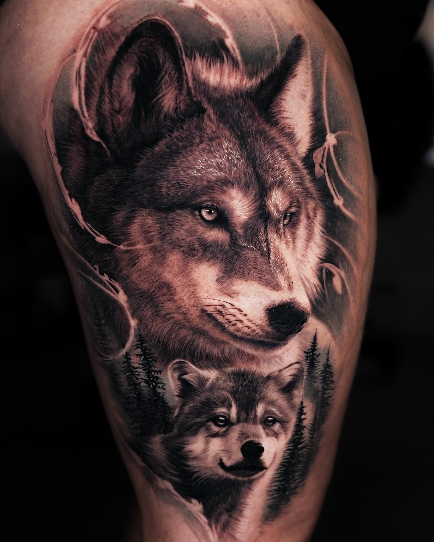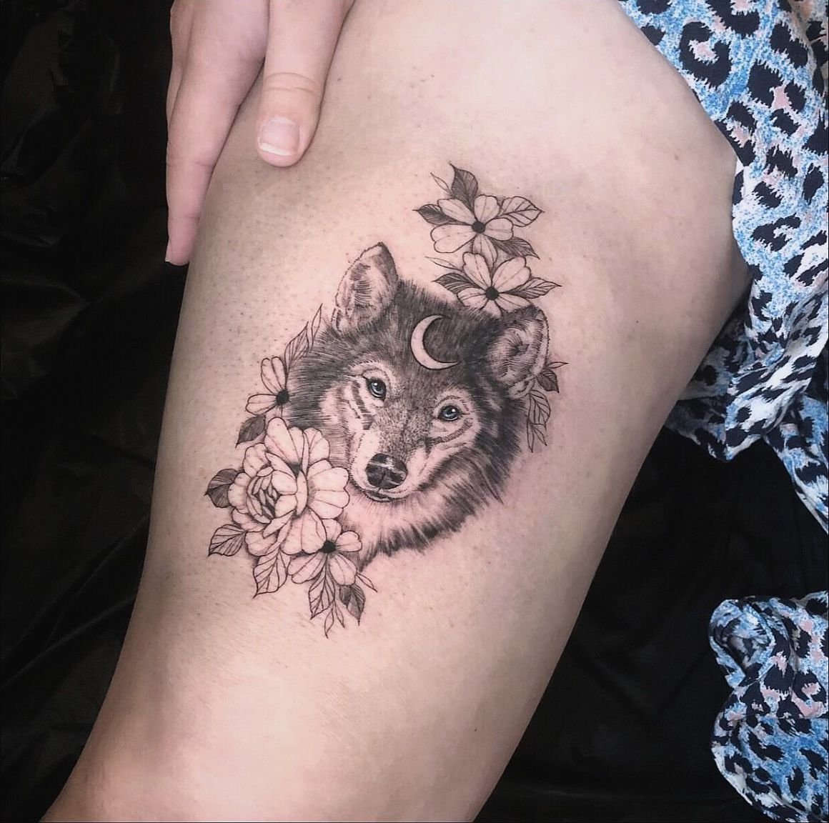 - Cuisse. Cette partie du corps convient également aux tatouages de grande taille et détaillés. Un loup sur la cuisse peut symboliser une force cachée et une grâce sauvage.