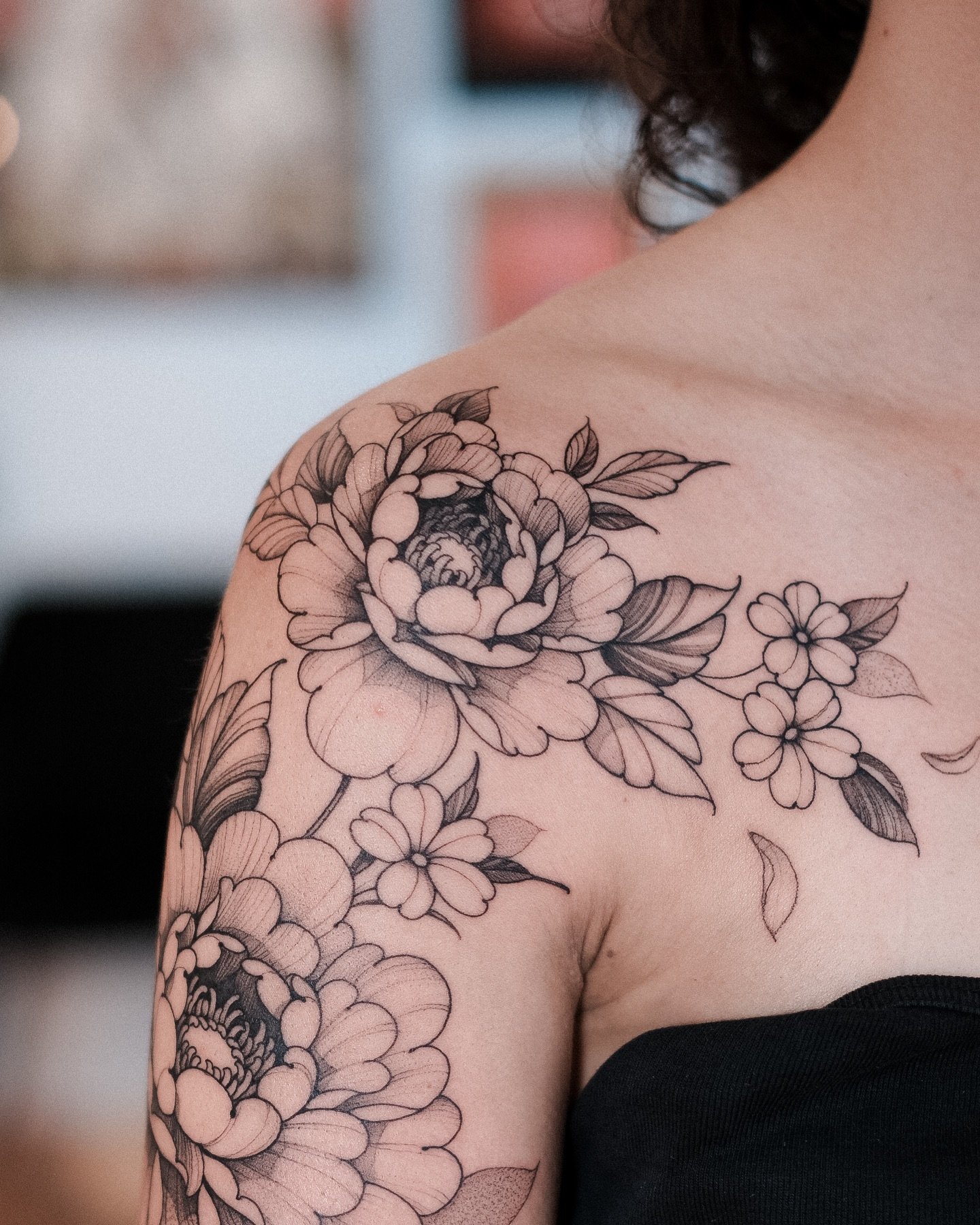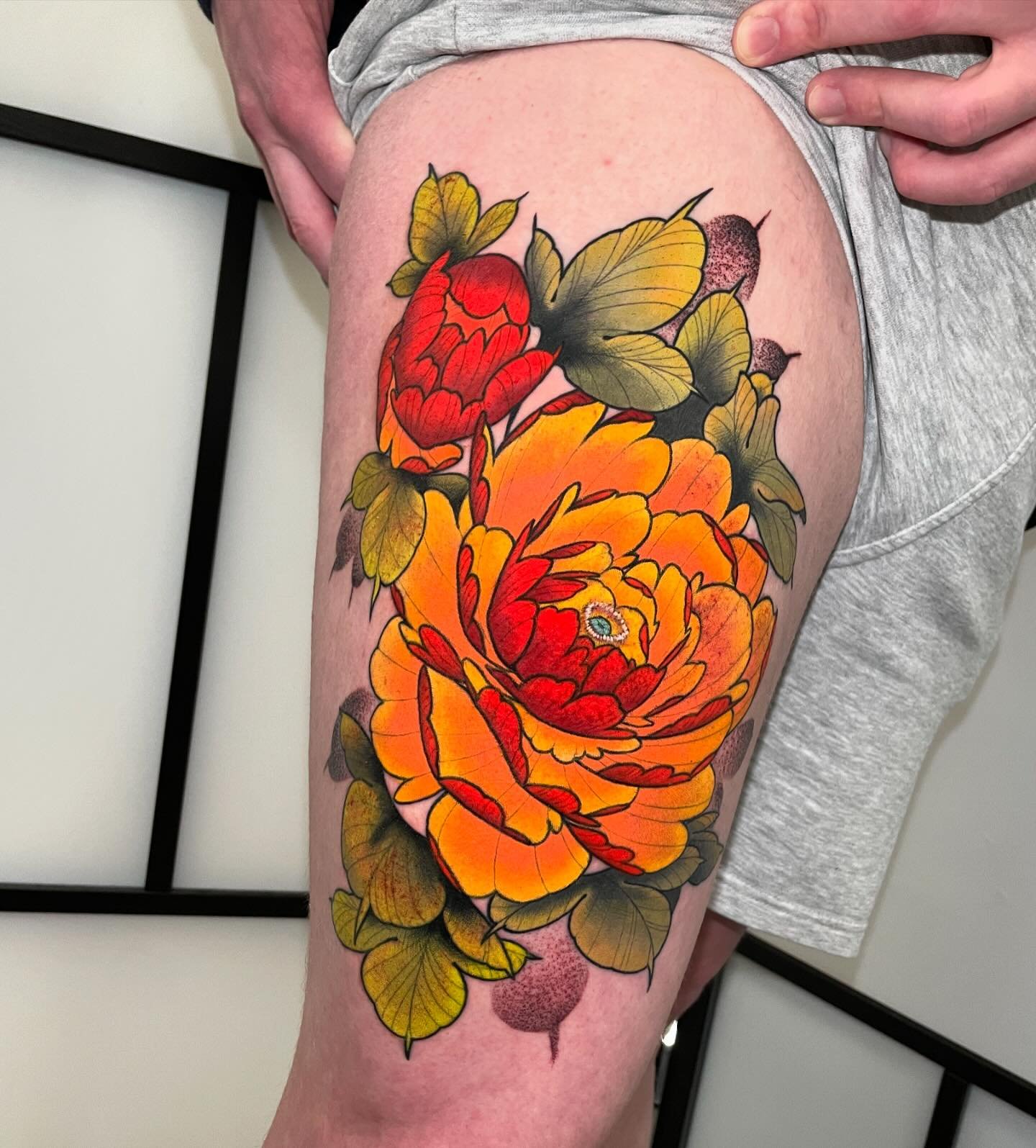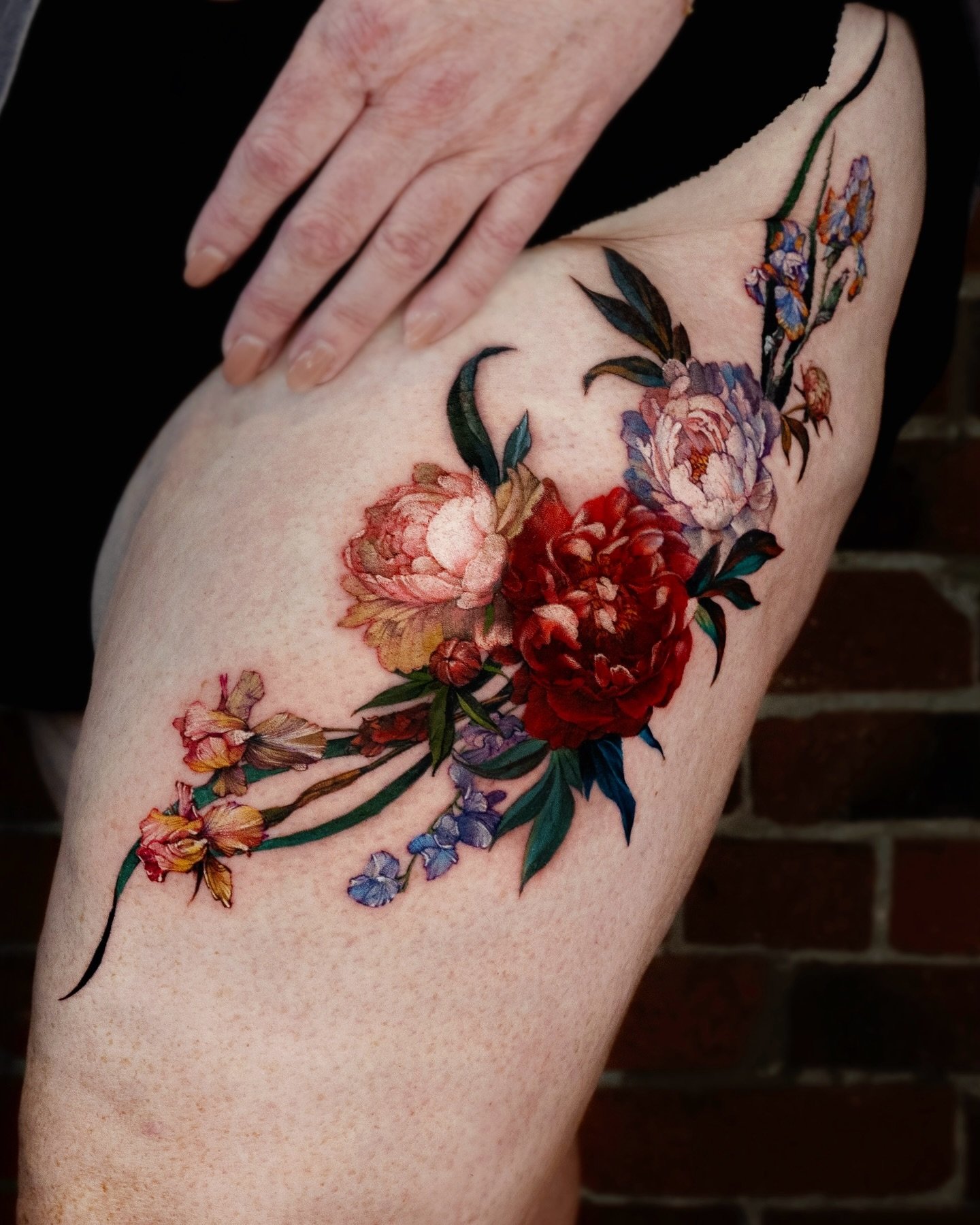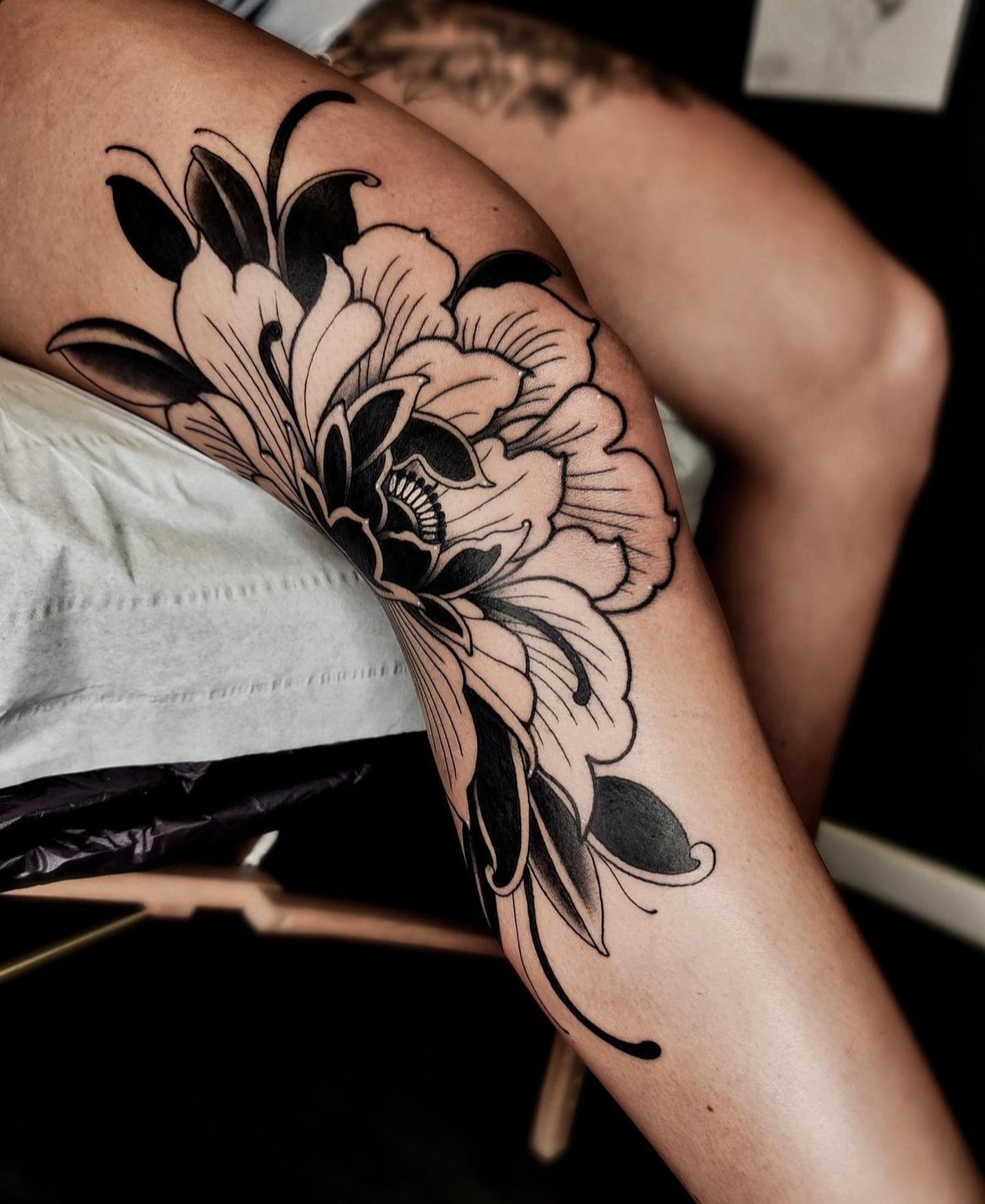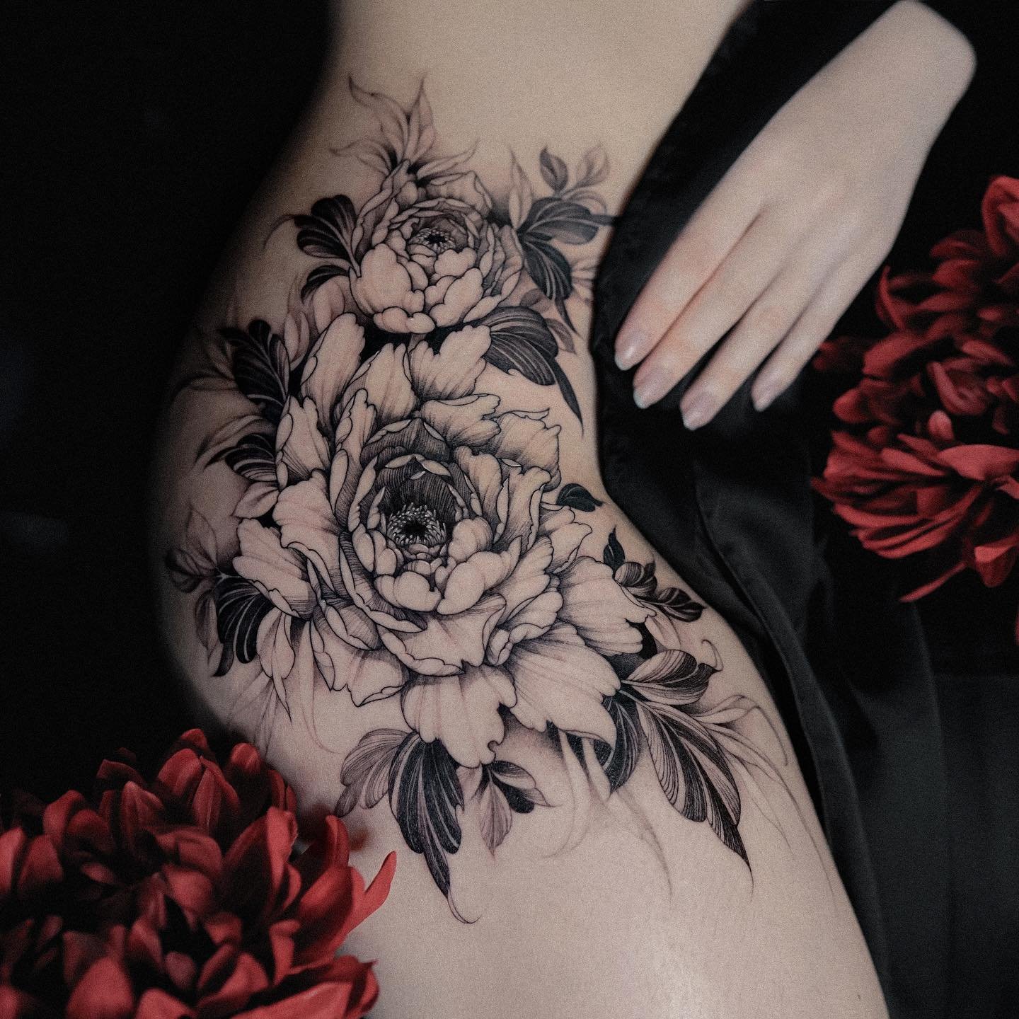 - Une grande pivoine sur la cuisse ou l'épaule – souligne la beauté et les courbes du corps, ajoutant sensualité et féminité à l’image. Un excellent choix pour les tatouages de grande taille, que l’on peut montrer ou cacher facilement.