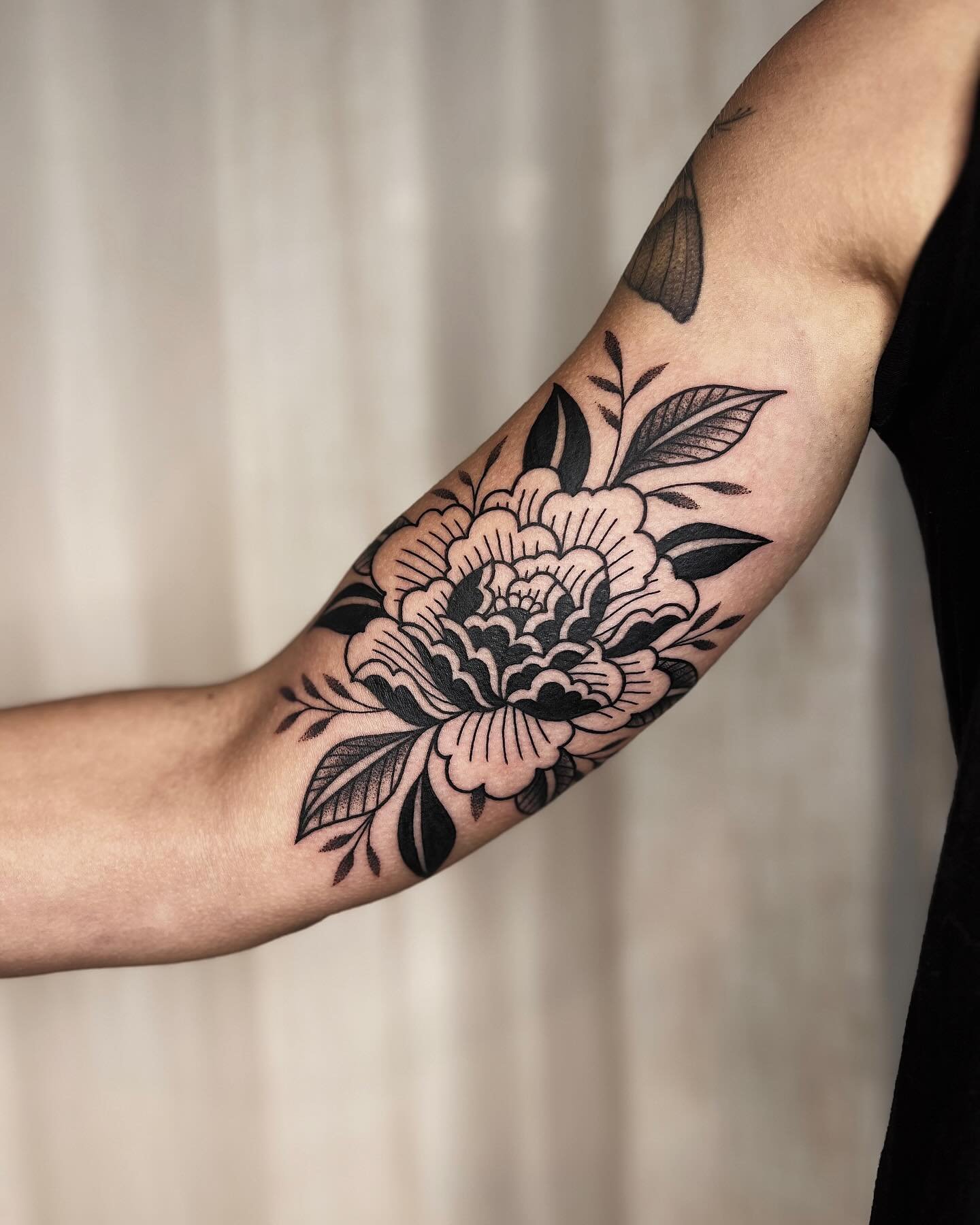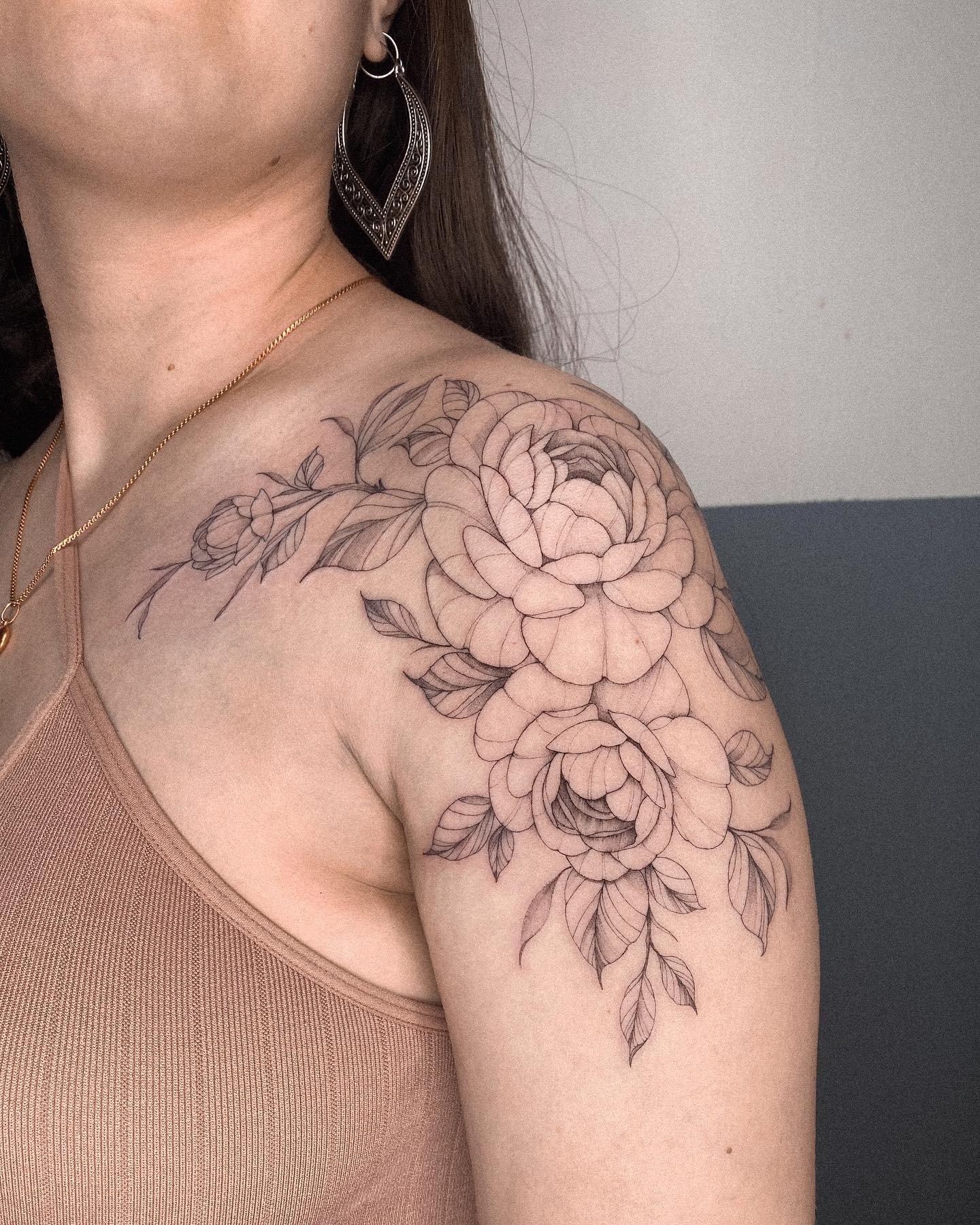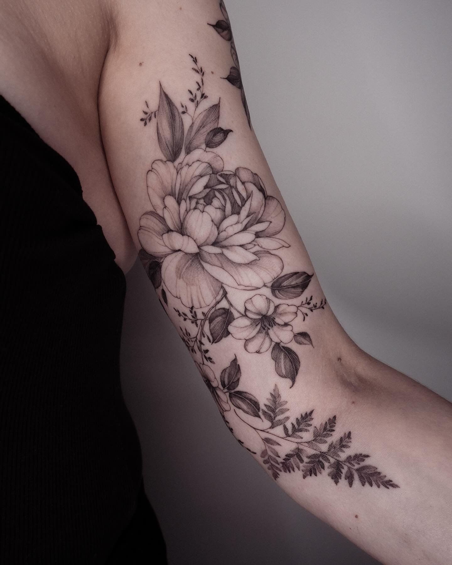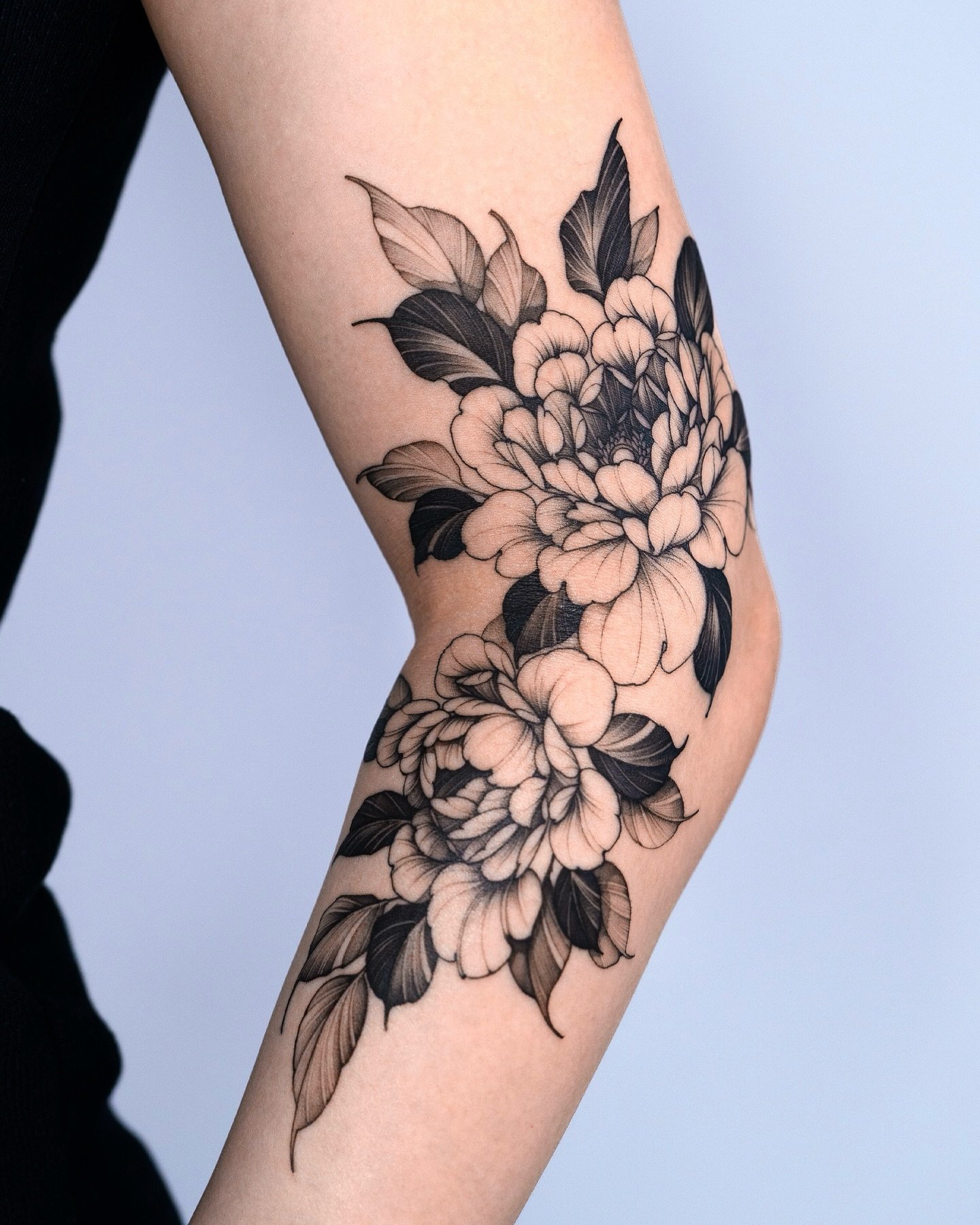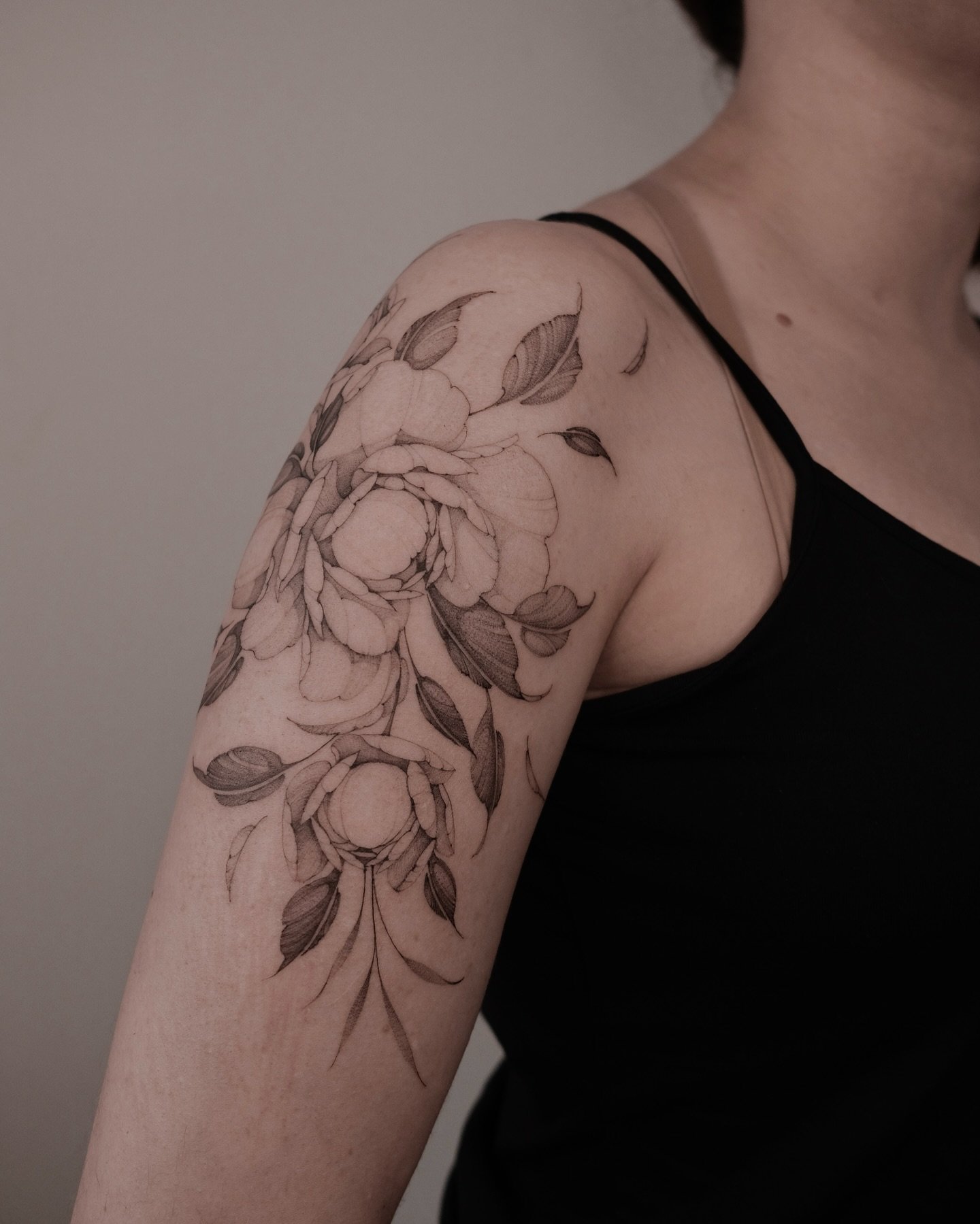 - Une grande pivoine sur la cuisse ou l'épaule – souligne la beauté et les courbes du corps, ajoutant sensualité et féminité à l’image. Un excellent choix pour les tatouages de grande taille, que l’on peut montrer ou cacher facilement.